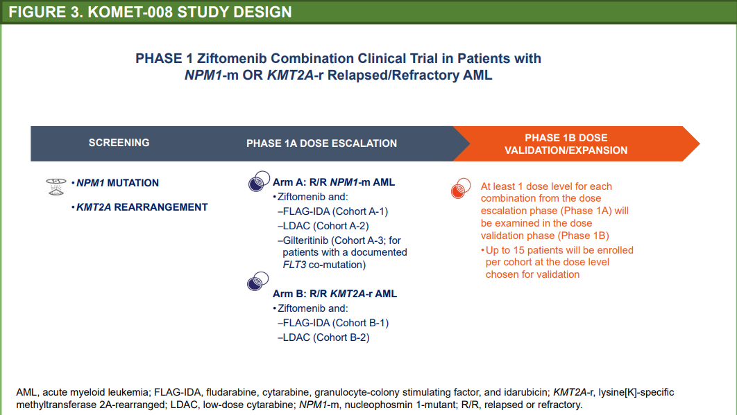在KOMET-001试验的1A期剂量递增部分,在30名复发性或难治性AML患者中,Ziftomenib显示出广泛的治疗窗口和令人鼓舞的单一治疗活性。共有53名患者在试验的1B期剂量验证和剂量扩展部分接受治疗,该试验由两个随机扩展队列组成,每个队列由核磷蛋白1-或NPM1-突变体和KMT2A-重排AML患者组成。在KOMET-001试验的1B期部分,Ziftomenib在600 mg时显示出最佳的临床效益,该剂量被指定为推荐的2期剂量(RP2D)。