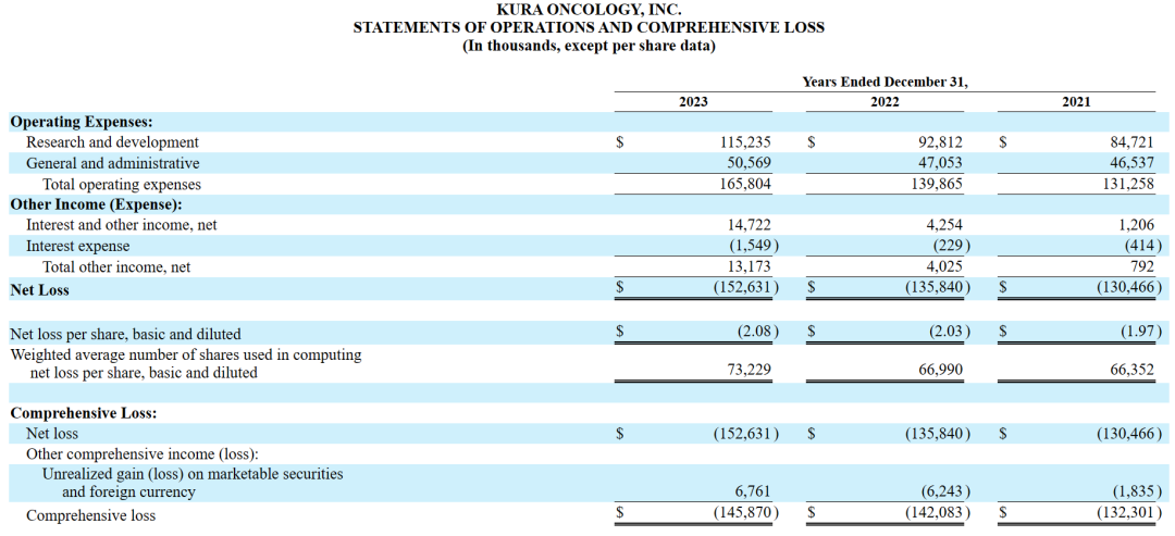 一般及行政开支:与2022年相比,截至2023年12月31日止年度的一般及行政开支增加,主要是由于专业费用及人员成本增加所致。Kura预计其一般及行政开支将于未来期间增加,以支持计划增加的研发活动。