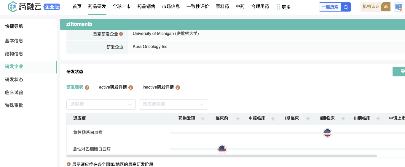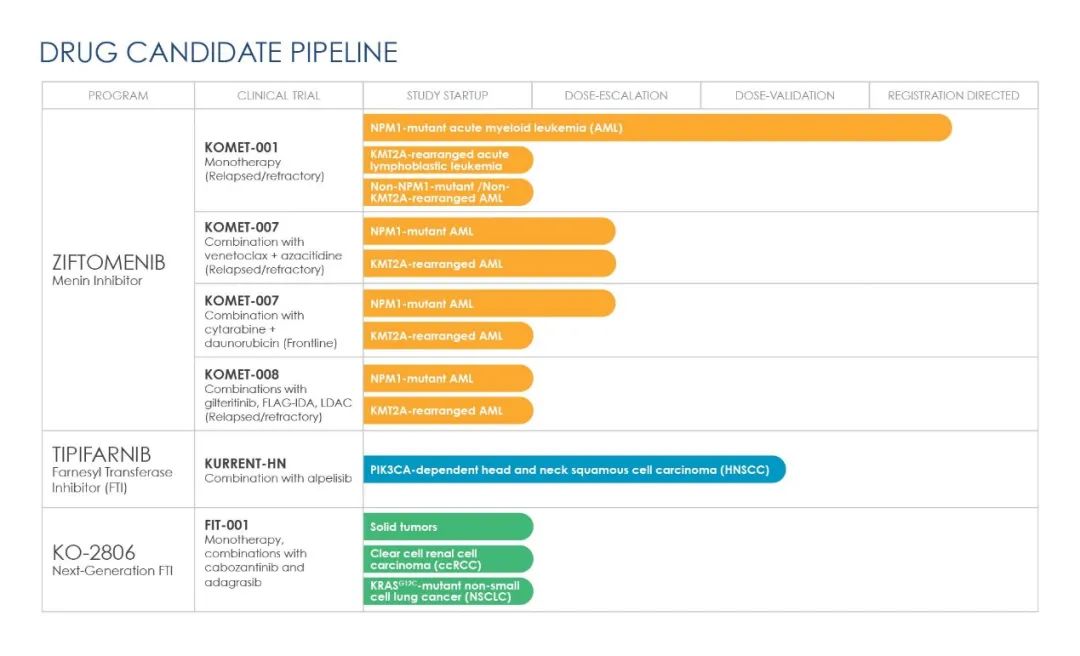 2019年7月,Kura从美国食品和药物管理局(FDA)获得了Ziftomenib治疗急性髓系白血病(AML)的孤儿药指定。并于2019年9月启动了Ziftomenib治疗复发性或难治性AML的全球Menin-KMT2A 1/2期临床试验,称之为Kura Oncology Menin-KMT2A试验,或KOMET-001。