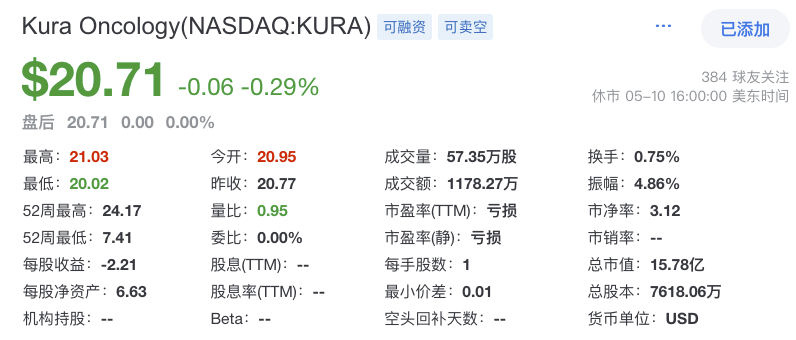 Kura成立于2014年,成立一年后,即2015年成功在纳斯达克上市。截至2024年2月28日,Kura股价21.38美元/股,市值约16.28亿美元;5月10日,约15.78亿美元。发展10年来,该公司在10轮融资中共筹集到了10亿美元资金。