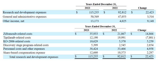 研发费用:与2022财年相比,在2023财年,该公司与Ziftomenib相关的研发费用增加,主要是由于与注册指导的Ziftomenib临床试验和启动Ziftomenib联合试验相关的成本增加;Tipifarnib相关的研发费用有所减少,主要是由于Tipifarnib注册指导试验的结束;与KO-2806相关的研发费用增加,主要是由于一期临床试验相关的成本增加;发现阶段项目相关的研发费用增加,主要是由于该公司临床前阶段候选产品的研究活动增加。随着Kura继续为Ziftomenib和FTI项目进行临床开发活动,预计研发费用将在未来增加。
