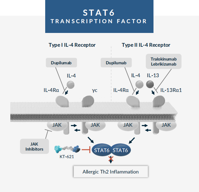 KT-621是Kymera开发的一款潜在First-in-Class的口服STAT6降解剂,处于临床前研究阶段。STAT6是IL-4/IL-13信号通路的重要转录因子,也是过敏性疾病中2型炎症的中心驱动因素,包括特应性皮炎、结节性瘙痒症、哮喘、慢性阻塞性肺病、慢性鼻窦炎伴鼻息肉、嗜酸粒细胞性食管炎等。STAT6是一个经过基因验证的靶点,该途径已通过批准的IL-4/IL-13靶向生物制剂进行临床验证,如度普利尤单抗。Kymera认为,STAT6降解剂与靶向生物制剂相比,具有完全抑制该途径的潜力,且每日口服给药更加便利。临床前研究显示,KT-621在所研究的所有疾病相关的人类原代细胞类型中都显示出了皮摩尔效力的降解能力,且在人类细胞和动物模型中的临床前活性等于或优于靶向IL-4Rα的单克隆抗体度普利尤单抗,从而在许多皮肤病学、呼吸道和胃肠道过敏性疾病中显示出广泛的潜力。目前KT-621正在开展IND enabling研究,预计将在2024年下半年开展1期临床试验,并在2025年公布1期研究结果。