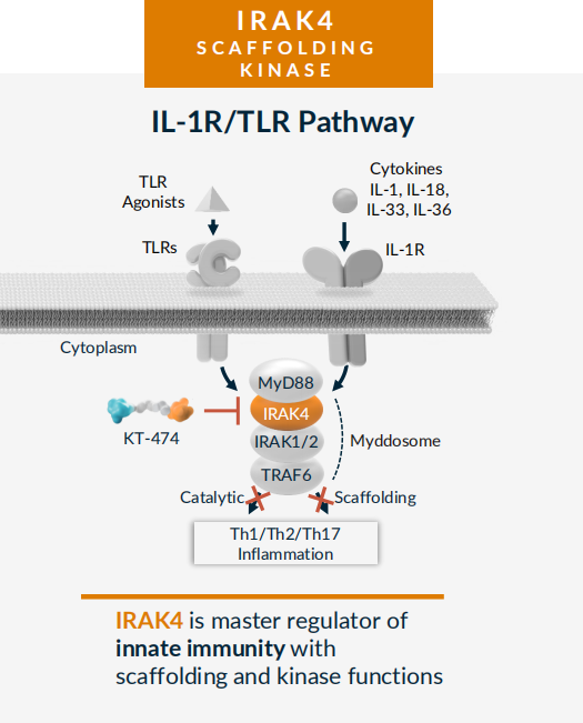 该公司选择降解IRAK4(白细胞介素-1-受体相关激酶-4)是因为该靶点在IL-1R/TLR通路相关免疫和炎症中的作用得到了充分验证,且IRAK4是IL-1R/TLR信号通路中的一个关键节点,与多种不同炎症介质具有潜在关联,该信号通路同时依赖于IRAK4的激酶活性和支架功能。