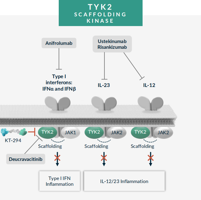 KT-294是Kymera开发的一款潜在First-in-Class的口服TYK2降解剂,TYK2是JAK激酶家族的一个成员,它结合IL-12、IL-23和I型IFN受体,招募并使信号转导和激活转录(STAT)转录因子磷酸化。此外,TYK2具有成熟的支架功能,在细胞因子受体的表面表达和激活中发挥关键作用。TYK2的变构抑制剂(氘可来昔替尼)以及多种靶向IL-12、2IL-23和IFN-α的生物制剂已被批准用于多种自身免疫性疾病的治疗,因此TYK2是一个高度验证的靶点。不过,KT-294与氘可来昔替尼不同,并不抑制IL-10信号传导,IL-10在肠道内稳态中起重要作用,从而有望成为炎症性肠病、狼疮和牛皮癣等多种适应症的同类最佳药物。非人类灵长类动物研究显示,KT-294在低口服剂量下实现了TYK2的体内剂量依赖性的深度降解。目前KT-294正在开展IND enabling研究,预计将在2025年上半年开展1期临床试验,并在2025年公布1期研究结果。