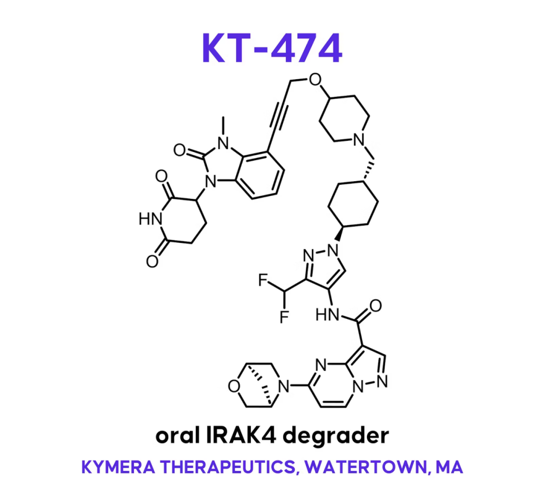 Kymera公司的领头项目KT-474是一种高活性、选择性、口服生物可利用的潜在First-in-ClassIRAK4降解剂,用于治疗IL-1R/TLR驱动的免疫炎症适应症和存在高度未满足医疗需求的疾病,开发进度最快的适应症是化脓性汗腺炎(HS)和特应性皮炎(AD)。