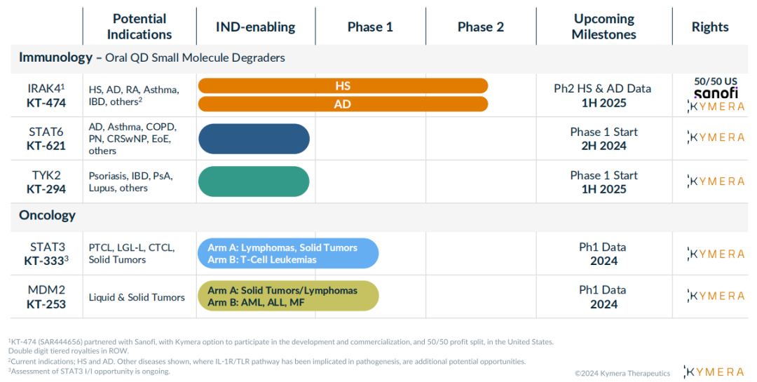 Kymera公司目前拥有靶向IRAK4、STAT3和MDM2的临床阶段项目,靶向STAT6和TYK2的临床前项目,以及早期开发阶段的多个项目,并在探索肿瘤学和免疫学之外的治疗靶点。