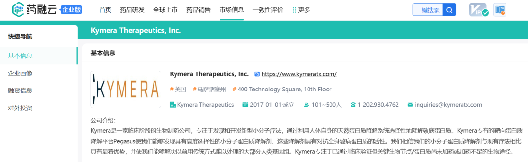 药融云数据库显示,Kymera Therapeutics(NASDAQ:KYMR)是一家临床阶段的生物制药公司,使用靶向蛋白质降解(TPD)技术发现和开发新的小分子药物,Kymera与药融圈此前发布的Arvinas均是TPD领域的龙头公司,但与Arvinas不同的是,Kymera重点布局了免疫/炎症领域。在靶点选择上,Kymera专注于已经经过临床验证,但关键生物节点/蛋白尚未实现成药或难以成药的疾病通路。Kymera曾入选2019年“生物技术猛公司”(FierceBiotech’s 2019 Fierce 15)。