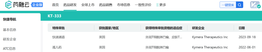 1期临床研究中期数据显示,KT-333对STAT3的最大降解率高达96%;肿瘤中STAT3和pSTAT3阳性细胞分别减少了69%和87%;5例CTCL(皮肤T细胞淋巴瘤)患者中有3例(2例PR和1例SD),典型霍奇金淋巴瘤中1例PR的疾病控制,显示出单药活性;在实体肿瘤中,观察到4例头颈部肿瘤(H&N肿瘤)患者SD时间延长。在1期研究治疗后,一名CTCL患者的肿瘤活检诱导了干扰素γ标记预测抗PD-1治疗的敏感性,表明KT-333具有与PD-1抗体联合用药的潜力。Kymera预计KT-333将在2024年完成1a期剂量爬坡试验,并希望在2024年提供更多的临床数据。药融云数据www.pharnexcloud.com显示,美国FDA已授予KT-333用于治疗复发/难治性外周T细胞淋巴瘤的快速通道资格和孤儿药认定。