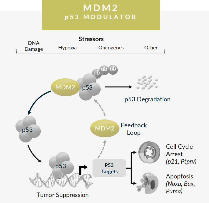 KT-253是Kymera开发的一款潜在First-in-Class的MDM2降解剂,拟用于治疗实体肿瘤和血液系统恶性肿瘤。MDM2(双微体同源基因2)是最常见的肿瘤抑制因子p53的关键调控因子,在50%的野生型p53肿瘤中,MDM2的过表达和扩增可使p53失活。MDM2小分子抑制剂的活性受限于p53-MDM2反馈回路,干扰小分子抑制剂的药理作用。与小分子抑制剂不同,MDM2降解剂可去除该蛋白,克服p53依赖的反馈回路,上调MDM2的产生,从而产生急性凋亡反应。