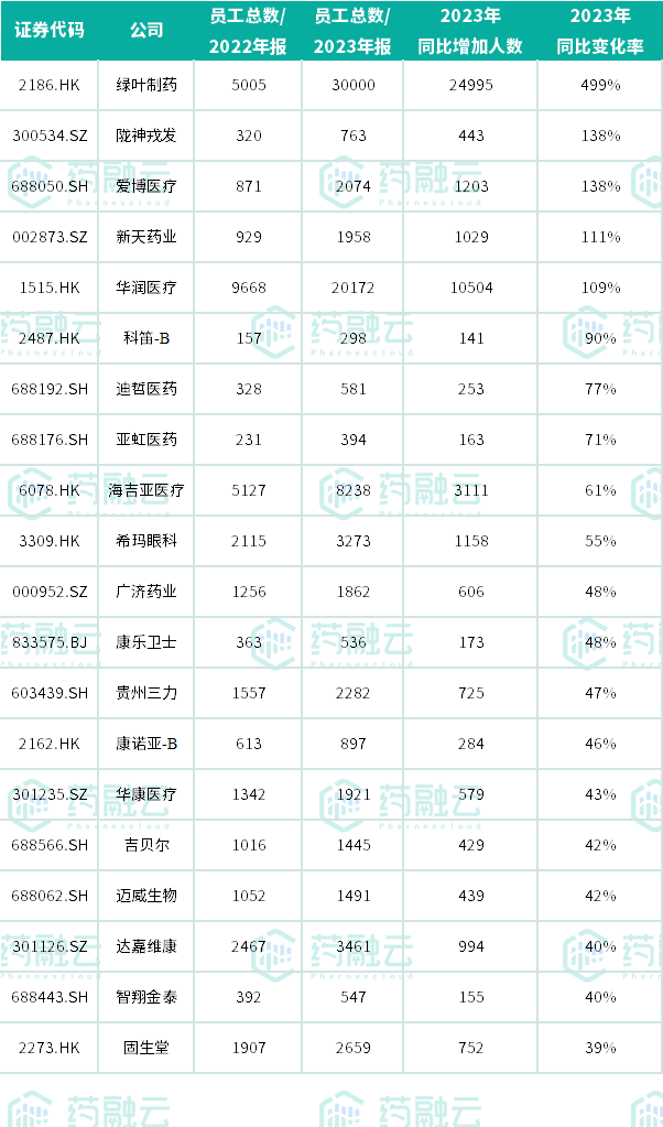 新药研发企业绿叶制药、科迪、迪哲医药、亚虹医药、康诺亚和迈威生物均有产品刚上市或有产品准备上市。陇神戎发系收购普安制药业务扩张所致人员快速增加,华润医疗也是由于收购辽健及江能医院业务扩张,员工人数快速增加。爱博医疗、海吉亚医疗处于快速扩张期。