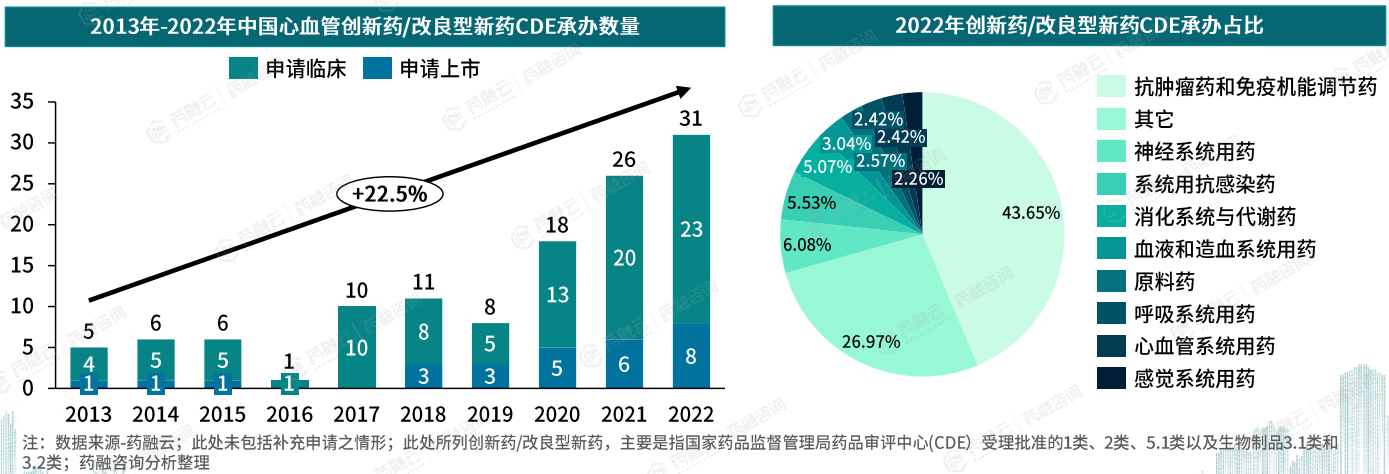 近年来,中国心血管系统药物领域展现出强劲的研发活力。据药融云数据库统计,从2013年至2022年,中国心血管系统创新药/改良型新药的注册申请数量呈现逐年递增的趋势,年复合增长率高达22.5%。尽管如此,2022年共有31项心血管药物申请被药品审评中心(CDE)受理,仅占当年CDE总受理量的2.42%,这反映出心血管药物因临床成功率偏低、研发周期较长等因素,导致新药进入市场的门槛较高。