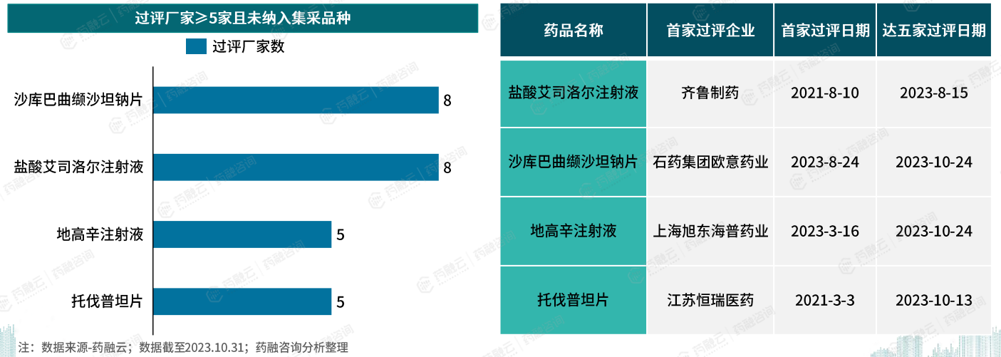 这些未纳入集采的品种(盐酸艾司洛尔注射液、沙库巴曲缬沙坦钠片、地高辛注射液、托伐普坦片),其一致性评价达五家的日期均晚于2023年8月。