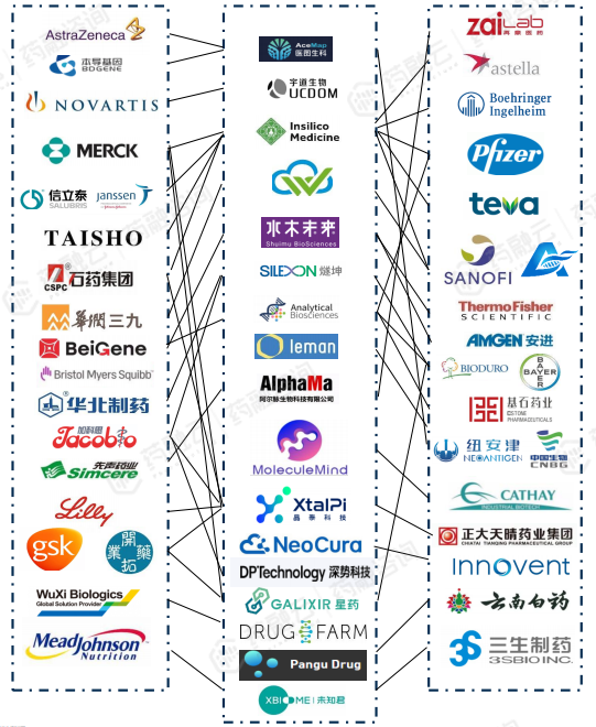 中国主要AIDD行业与大型制药企业/Biotech企业合作关系网络