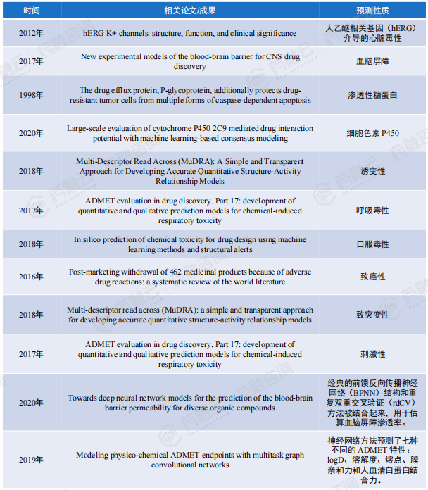 从人工智能中受益的药物发现的关键领域之一是ADMET性质预测,通过定量结构活性关系(quantitative structure–activity relationship,QSAR)模型来预测多种性质,从简单的物理化学性质到复杂的药代动力学(PK)、药效学(PD)和毒理学特性。重要的PK端点包括清除率、通透性和稳定性;重要的药效学端点包括药物靶标特异性和选择性;重要的毒理学端点包括细胞色素P450诱导和hERG抑制等。