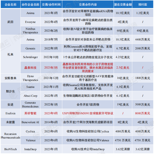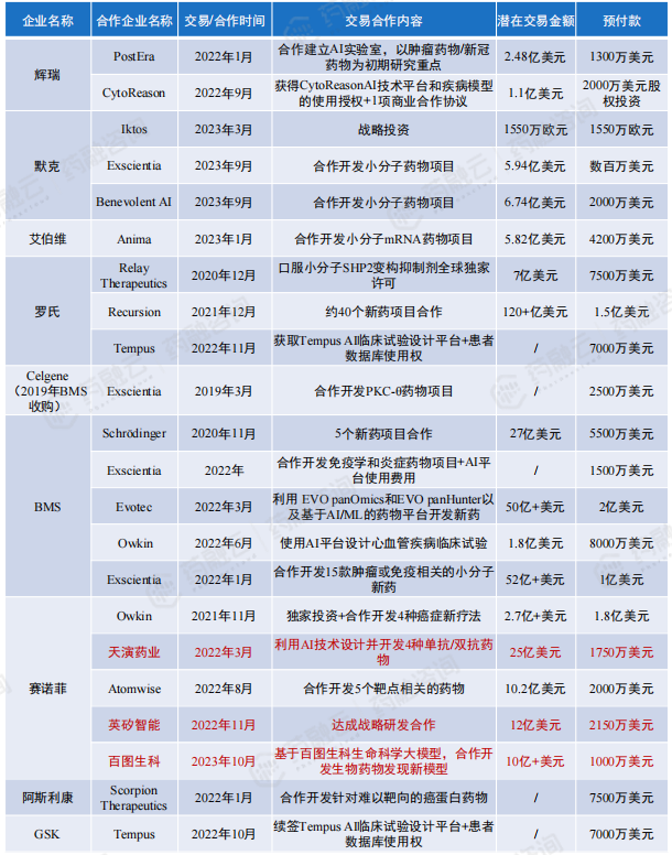 全球AI制药企业大宗项目合作交易