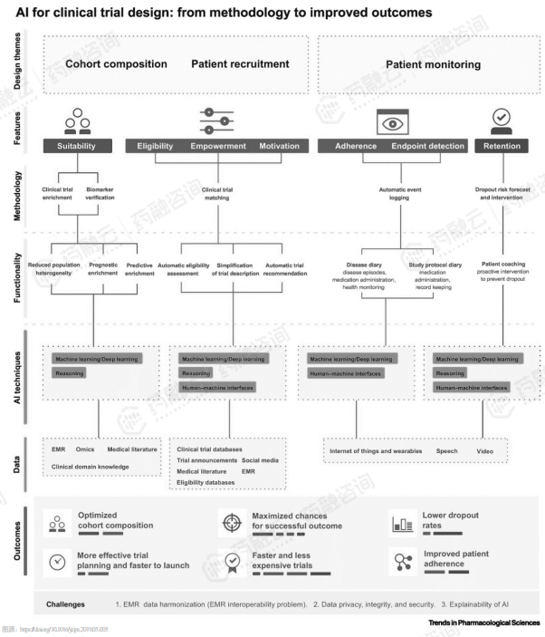 但临床试验阶段有较大不同,是以生物学过程为主,其复杂性在数据和AI建模两方面带来巨大挑战。在数据方面,需要将临床数据加以结构化处理,而诸如病历、随访记录目前还很难标准化、数字化;此外,由于涉及患者隐私,目前尚无能充分保障数据安全的有效措施,这也限制了临床数据的灵活运用。在AI建模方面,化合物与人体靶点的反应过程非常复杂,但目前理论认知还不足,受环境影响因素很大,数据稳定性和可重复性差,所以不利于AI建模,对疗效和安全性的影响也难以把控。