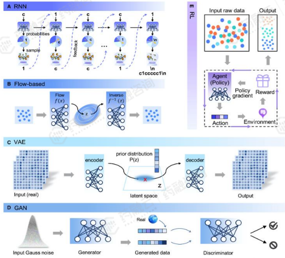 GAN主要由生成器和鉴别器组成,它们相互博弈,互相对抗,通过对抗生成高质量的数据。GAN能够生成与真实数据分布相似的新样本,并能够使用网络来辨别网络,删除不需要的内容。在AIDD领域,GAN 通常与特征学习和强化学习等技术相结合,在蛋白质功能预测、小分子生成等方面发挥了重要作用。基于 GAN已经构建多种分子生成模型,如Mol-CycleGAN、ORGANIC、RANC。