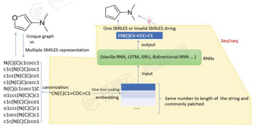 基于RNN的生成模型可以生成具有全新结构的化合物,同时保持与样本化合物具有相似的生化特性。训练过程首先利用大型化学数据库对RNN模型进行训练,使其学习如何生成正确的化学结构。然后使用强化学习算法对 RNN 参数进行微调,使模型能够将生成的化学结构映射到指定的化学空间。强化学习使基于 RNN 的生成模型能够生成具有良好药理特性的新分子,并确保生成分子的结构多样性。