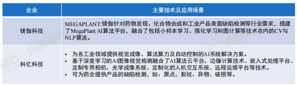 我国制药行业年产量高,且种类众多,胶囊、片剂等在生产及铝塑封装过程中不可避免会产生缺粒、凹坑、破损、批号不清等缺陷。在制药过程中,除生产工艺需要优化外,对于药品的质检也具有迫切需求。一些通过人工智能技术提供先进生产力的企业,涉足领域较广,也包含生命科学领域。如:镁伽科技、科亿科技等,此类企业多为药企提供产品的缺陷检测。