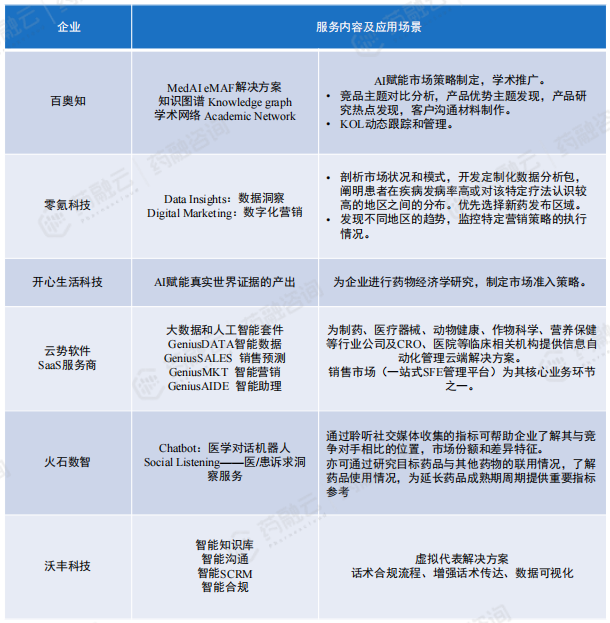 在此背景下,国内在AI赋能药物商业化上迎来一定进展,据药融数据统计,目前国内赋能药物市场开拓及商业化企业共六家。通过对其服务内容和应用场景进行分类,我们发现,企业提供服务内容大致可分为:与KOL的沟通交流、市场准入策略制定、销售预测、竞品对比以及话术合规。