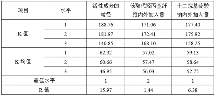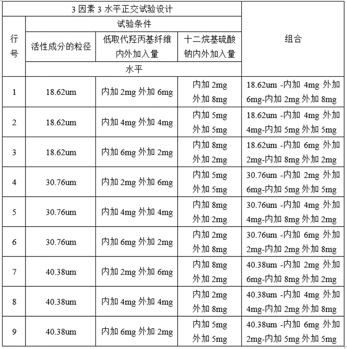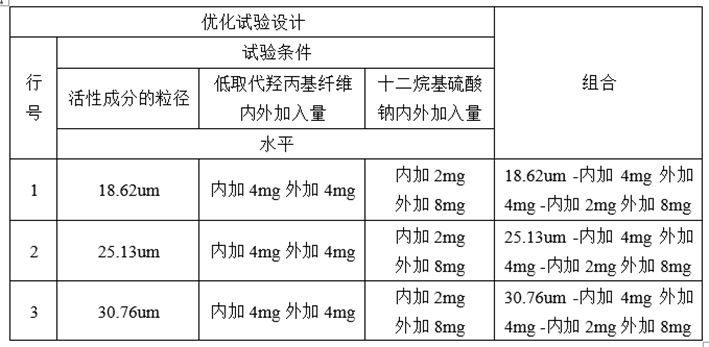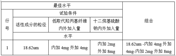 需要考察的参数有活性成分的粒径范围,崩解剂-低取代羟丙基纤维素内外加入的具体量,表面活性剂-十二烷基硫酸钠内外加入的具体量。采用科学的正交试验设计,通过考察工艺的顺畅性,溶出曲线的拟合性,从而筛选出活性成分的粒径范围,崩解剂-低取代羟丙基纤维素内外加入的具体量,表面活性剂-十二烷基硫酸钠内外加入的具体量。