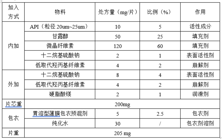 (1)混合:将处方量的API与甘露醇(过60目筛)、微晶纤维素(过60目筛)、十二烷基硫酸钠、低取代羟丙基纤维素(过60目筛)混合均匀(搅拌转速50r/min,10min);