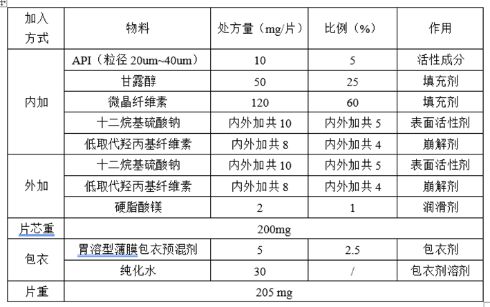 通过对以上六种原辅料的分析,可知填充剂-甘露醇、微晶纤维素的处方量已确定,润滑剂-硬脂酸镁的处方量已确定,通过对参比制剂分析,包衣剂-胃溶型薄膜包衣预混剂的处方量已确定。