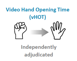 vHOT全称为Video Hand Opening Time,要求受试者进行最大程度的握力 5 秒,然后快速伸展手指,手不抖动,分别测量拇指和中指的最大张开时间,用于评估肌强直,数值越小越好。