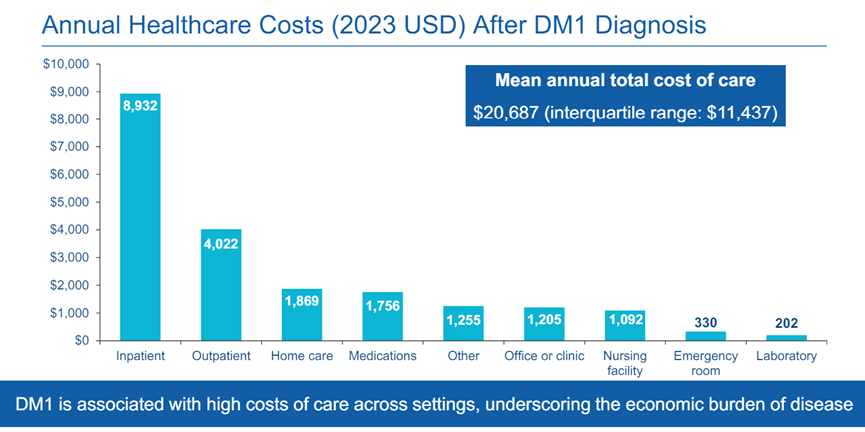 根据URMC和Dyne合作的真实世界研究数据显示,美国DM1患者平均每年医疗支出为2万美元,大部分为住院费用,其中医药费为1700美元。综合以上数据来看,DM1欧美国家医药市场规模在24亿美元。
