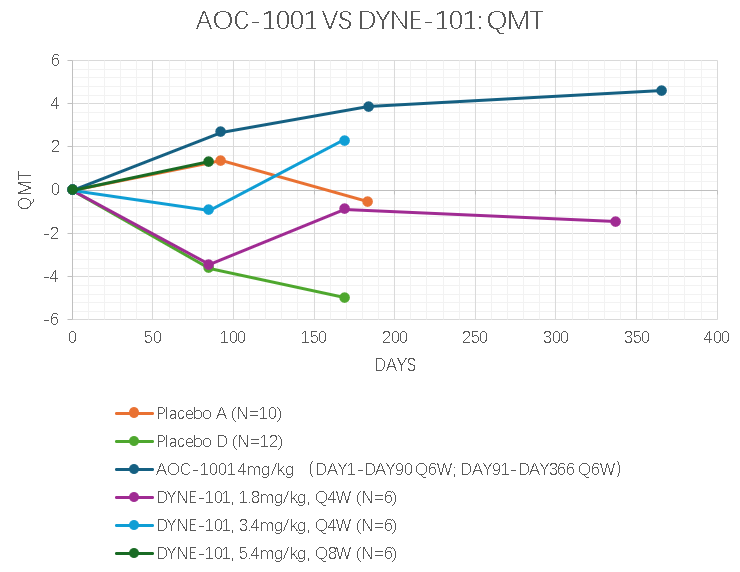 在QMT指标上,AOC-1001表现更好,DYNE-101 高剂量(5.4mg/kg)预计能够达到类似效果。