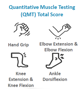 QMT,全称为quantitative muscle testing,使用测力计等设备,测试包括手、肘、膝盖和脚踝多个肌群的肌肉力量,数值越大越好。