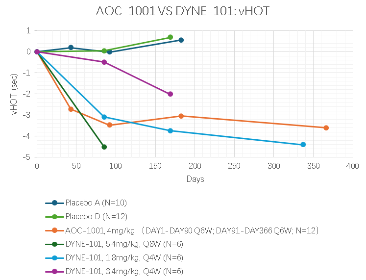 试验显示,两者都能显著改善vHOT指标。其中,DYNE-101在低剂量(1.8mg/kg)下,可达到与AOC-1001高剂量(4mg/kg)相似疗效,DYNE-101高剂量(5.4mg/kg),已初步显示出更好的疗效。
