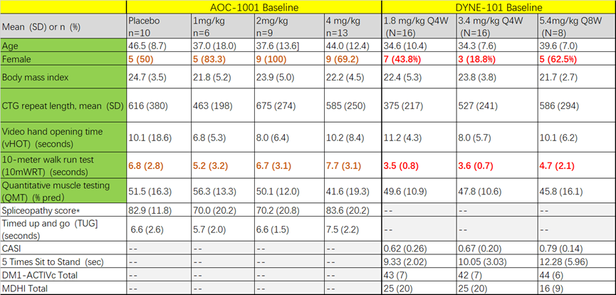 DYNE-101试验患者相比AOC-1001更加年轻,AOC-1001试验中招募了更多的女性患者,此外在10-meter walk run test 中,AOC-1001试验中的患者表现更差。其余相同指标表现一致。