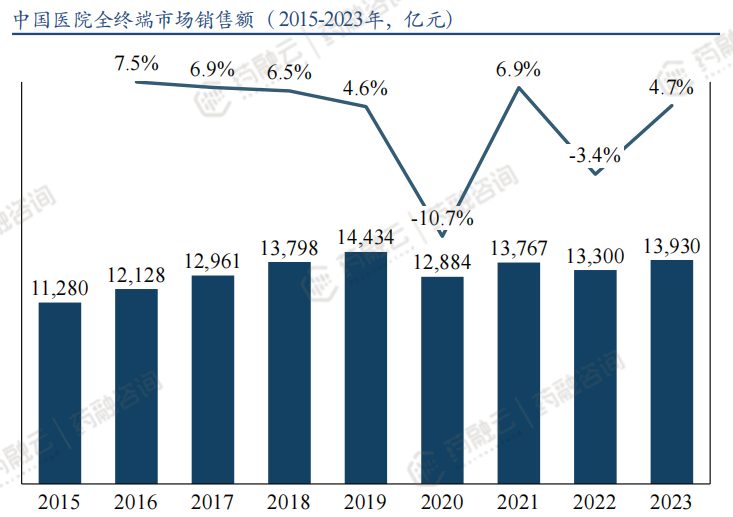 2023年,中国医院全终端药物销售展现恢复性增长,销售规模达到13930亿元,同比2022年增速达4.7%。从绝对值来看,暂未恢复到疫情前2019年的销售高峰。