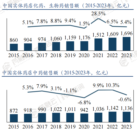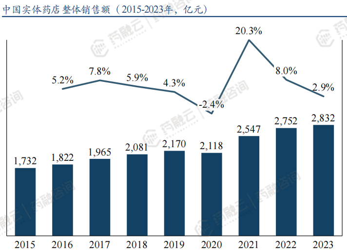 2023年中国实体药店药物销售额平稳增长,整体销售额达到2832亿元,同比2022年增速为2.9%,相比2021-2022年增速有所回落。
