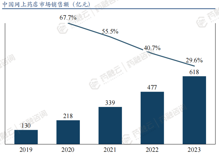 2023年,中国网上药店药物销售延续前几年的增长态势,销售额达到618亿元,增速高达30%。近几年,因为网上药店销售额整体基数低,呈现爆发式增长。