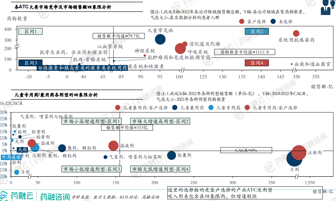 (2)剂型分析:在此通过四象限定义了4个市场,儿童药物未来增速主要来自市场小高增速及市场大低增速剂型。