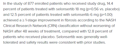 STELLAR-4中,在接受研究的877名入组患者中,14.4%(p=0.56)接受selonsertib 18 mg治疗的患者和12.5% (p= 1.00)接受selonsertib 6 mg治疗的患者在48周治疗后,实现大于等于1期纤维化改善且NASH无恶化,接受安慰剂的患者为12.8%,两个治疗组与安慰剂组相比均无统计学差异。