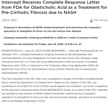 2023年6月22日, Intercept决定停止NASH领域所有投资,重新聚焦到罕见病和感染性肝病领域。