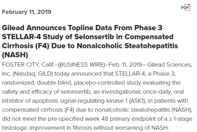 Selonsertib是Gilead开发的一款ASK1抑制剂。2019年2月,吉利德宣布Selonsertib用于治疗NASH 所致的代偿性肝硬化(F4)患者的3期临床试验(STELLAR-4)未达到主要终点。随后2019年4月,吉利德又宣布Selonsertib在另一个3期临床试验(STELLAR-3)也未达到48周的主要终点。