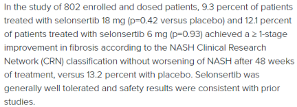STELLAR-3试验是一项临床3期试验,每日一次口服Selonsertib,用于治疗NASH 所致的纤维化(F3)患者。在接受研究药物的802名入组患者中,9.3%(p=0.42)接受selonsertib 18 mg治疗的患者和12.1% (p= 1.00)接受selonsertib 6 mg治疗的患者在48周治疗后,实现大于等于1期纤维化改善且NASH无恶化,接受安慰剂的患者为13.2%,两个治疗组与安慰剂组相比均无统计学差异。