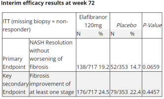 RESOLVE-IT III期试验评估了1070例经生物标志物证实的NASH患者(定义为NAS≥4,纤维化2期或3期)。患者按2:1随机分配,接受每日一次120mg Elafibranor或安慰剂。在第72周进行随访肝活检以评估组织学终点(NASH的缓解伴随无纤维化恶化或至少一个阶段的纤维化改善)。结果显示,接受Elafibranor治疗的人群NASH的缓解伴随无纤维化恶化比例(关键主要终点)为19.2%,安慰剂为14.7%,无统计学差异(p=0.0659)。