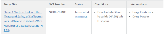 2020年5月,GENFIT公布了Elafibranor治疗成人NASH临床三期试验(RESOLVE-IT)中期分析结果:Elafibranor对NASH消退的主要终点无显著的统计学影响。