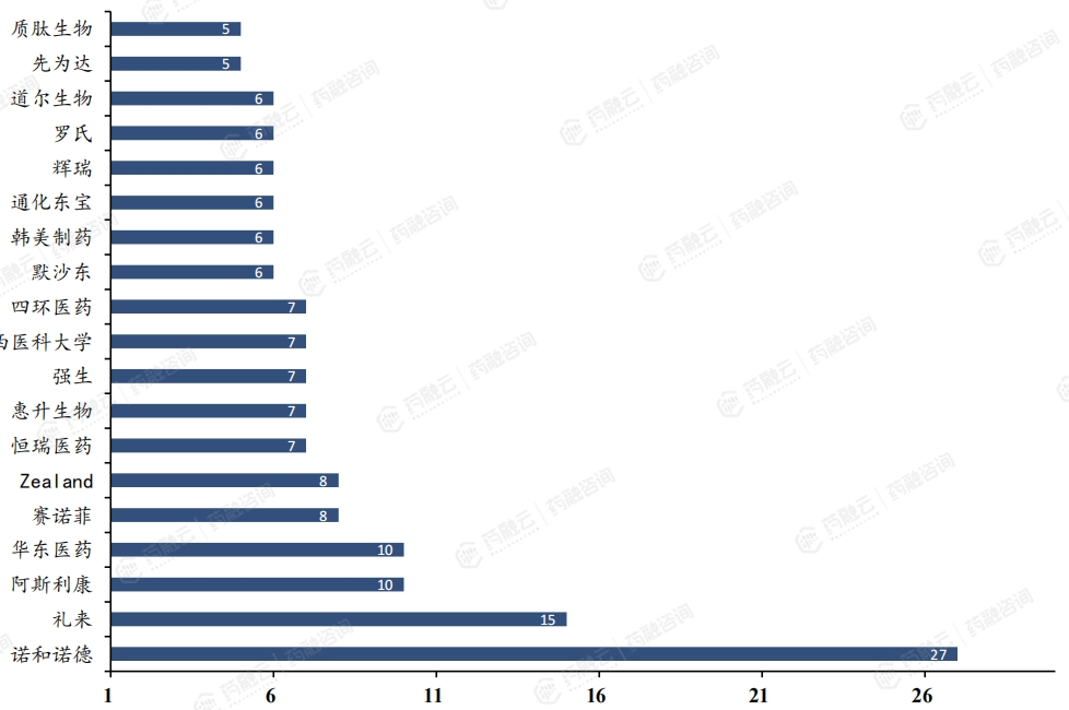 各公司在国内GLP-1药物研发数量排名(包含临床前至获批上市的所有创新药、改良新药、类似药项目)