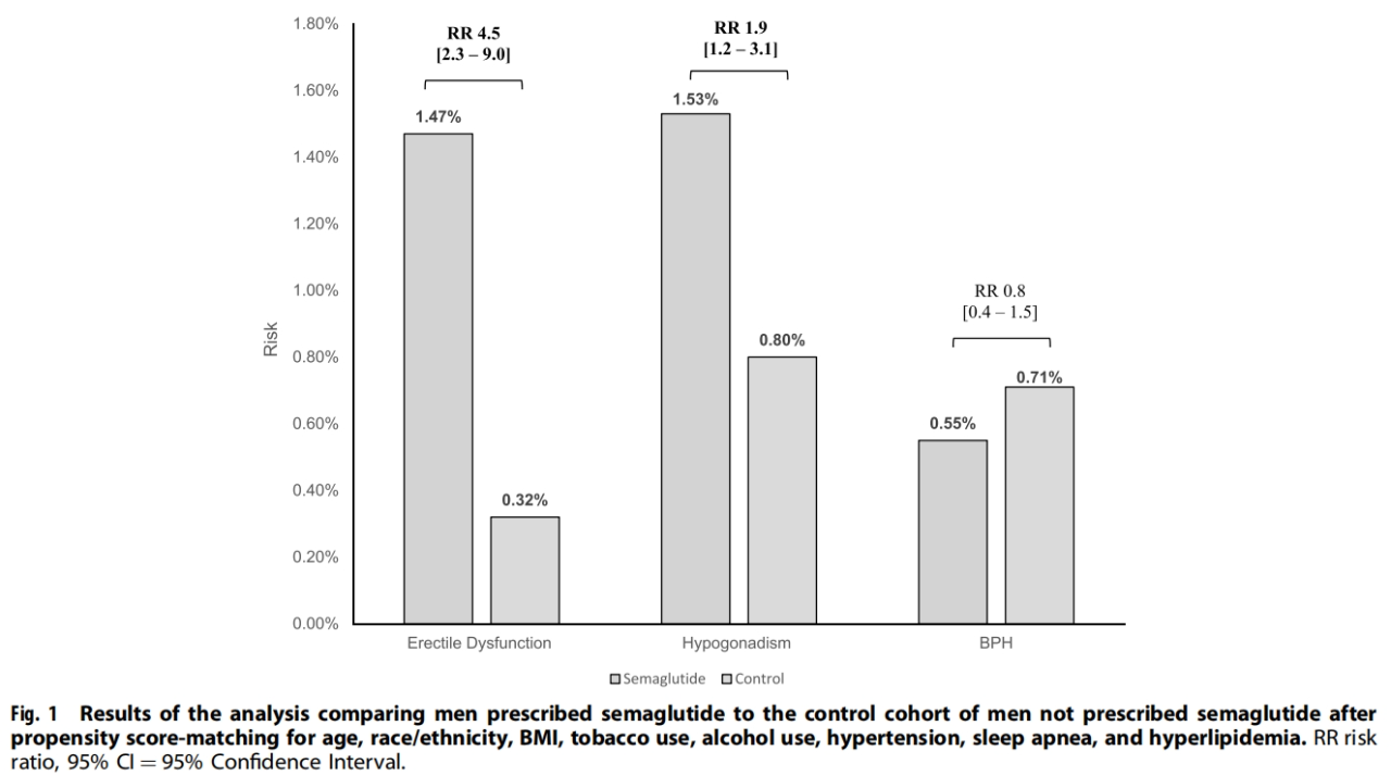 在这项研究中,科学家们通过对全球最大的真实世界数据来源TriNetX Research数据库的深入分析,对非糖尿病男性使用司美格鲁肽后可能出现的ED进行了细致的调查。研究结果显示,在使用司美格鲁肽的治疗组中,有1.47%的男性被诊断出患有ED或使用了PDE5抑制剂(一类治疗ED的药物),而对照组中这一比例仅为0.32%。此外,治疗组中还有1.53%的男性被诊断出患有睾酮缺乏症,而对照组中这一数字为0.80%。