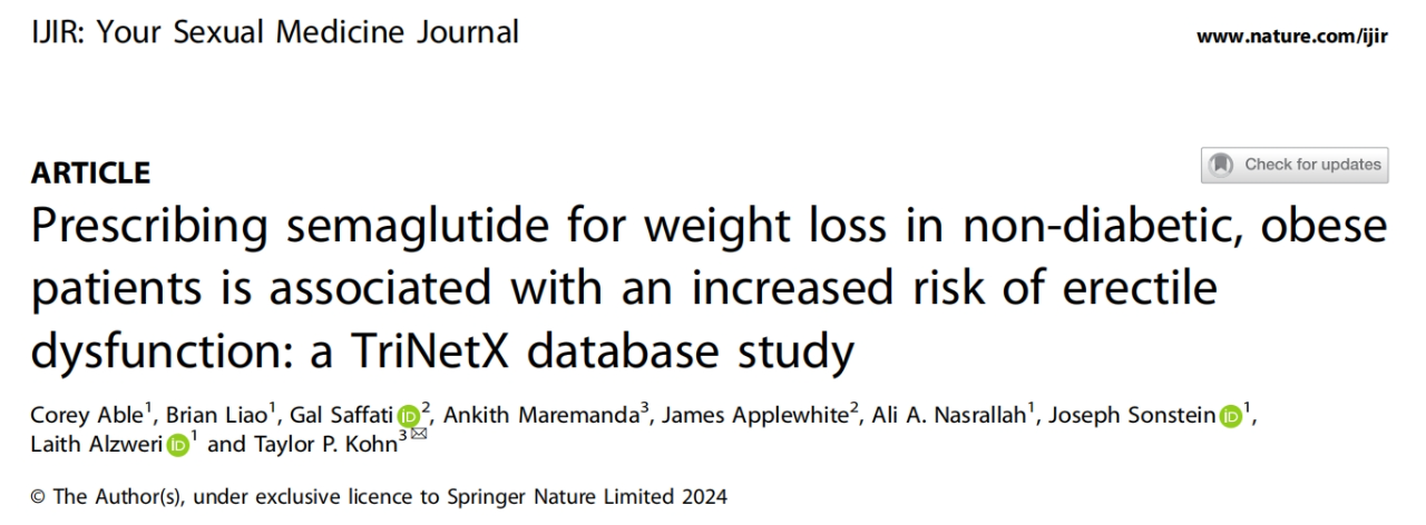 近期,一篇发表在《Nature》子刊《国际阳痿研究杂志》上的研究却给这款“神药”泼了一盆冷水。该研究指出,服用司美格鲁肽的非糖尿病男性更容易出现勃起功能障碍(ED),其风险增加了4.5倍。