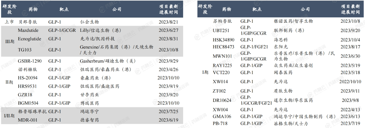 纵观国内GLP-1赛道,可谓“百花齐放、百家争鸣”,既涉及单靶点、双靶点、三靶点、口服小分子、生物类似药等药物类型,也覆盖了Biotech、Biopharma、Bigpharma等各类药企。据药融云数据显示,目前国内已有超百款GLP-1类新药进入临床阶段。