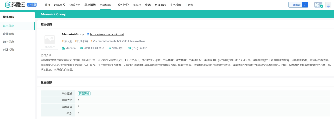 从药融云数据库获悉,成立于1886年的Menarini是意大利一家专注于心血管疾病、炎症镇痛、胃肠道疾病、肿瘤和代谢疾病的制药公司,总部设在佛罗伦萨,2022年统计的全球范围内员工高达17700多名,9个研发中心,且其附属公司、分销商和特许经营公司遍布全球140个国家。公司旗下有三个部门,分别是Menarini Ricerche,Menarini Biotech和Menarini Diagnostics。其中,Menarini Ricerche美纳里尼研究中心负责从新项目的创建到药物注册的所有研发活动;Menarini Biotech美纳里尼生物科技专注于心血管疾病、炎症镇痛、胃肠道疾病、肿瘤和代谢性疾病领域;Menarini Diagnostics美纳里尼诊断拥有遍布全球的附属合作伙伴和分销网络,专注于糖尿病、血液学、临床化学、尿液分析和免疫学,为专业医疗人员提供医疗诊断所需的科技方案。