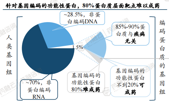 相比于小分子靶向药和生物药:CGT药物直接靶向DNA发挥作用,作用机制明确,打破蛋白质层面靶点难以成药魔咒,潜力巨大。根据 Nature Reviews Drug Discovery 披露,蛋白质编码基因仅占整个人类基因组的约1.5%,其中和疾病无关的蛋白质占其中的85%~90%。同时,在10%-15%与疾病相关的致病蛋白中,超过80%的蛋白质不能被目前常规的小分子药物以及生物大分子制剂所靶向,属于不可成药蛋白质靶点。