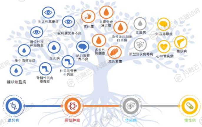 1. 应用领域从罕见病和血液瘤向实体瘤、传染病、慢性病扩大